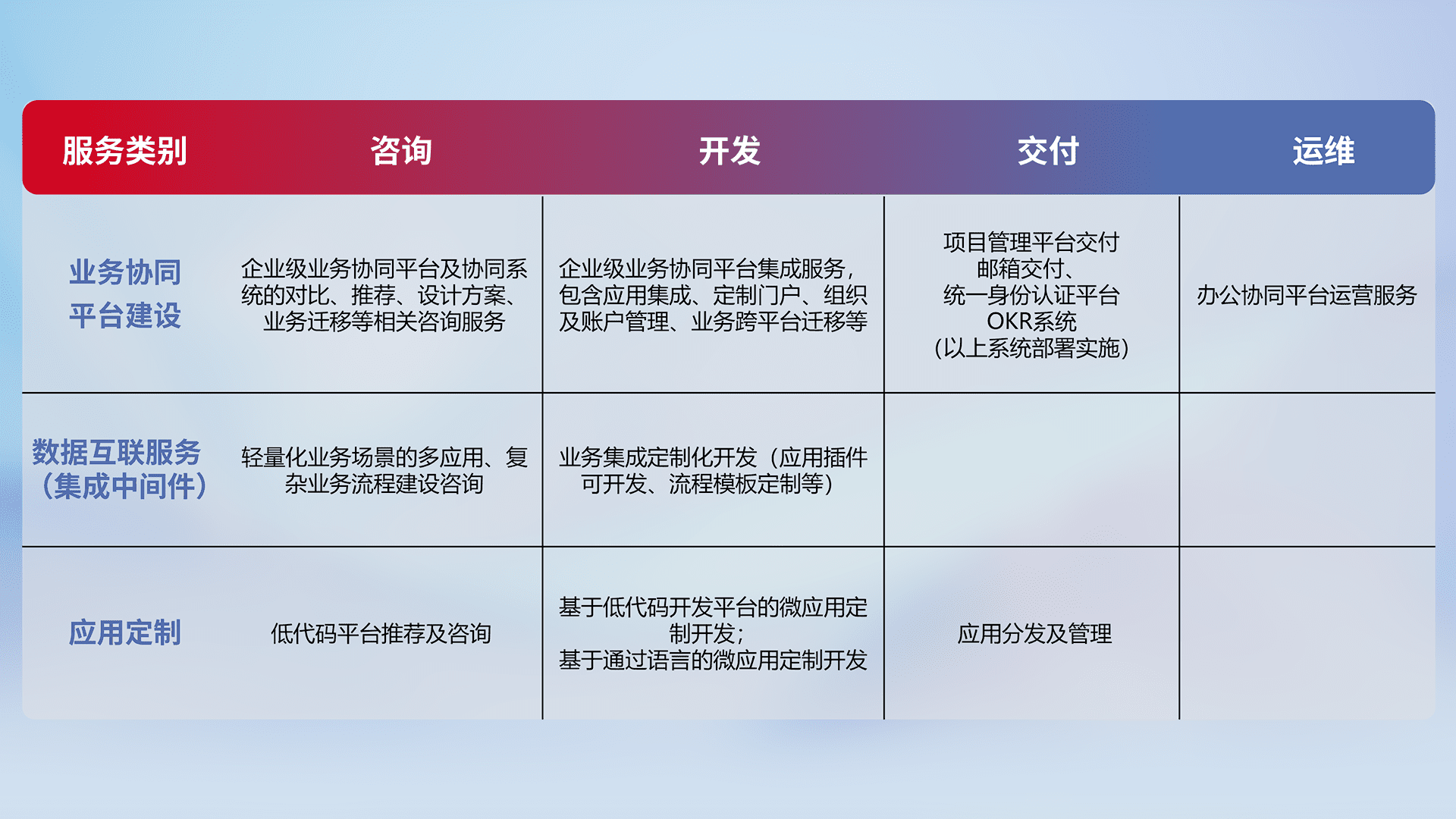 针对钉钉、、、企微、、、IDaas等平台级产品提供产品的规划、、、方案、、交付、、、、定制化开发等服务,,实现如统一协同办公、、、智能客户服务、、、、混合会议管理、、、、智能数据查询、、、、等业务场景,,,实现数字化转型。。
